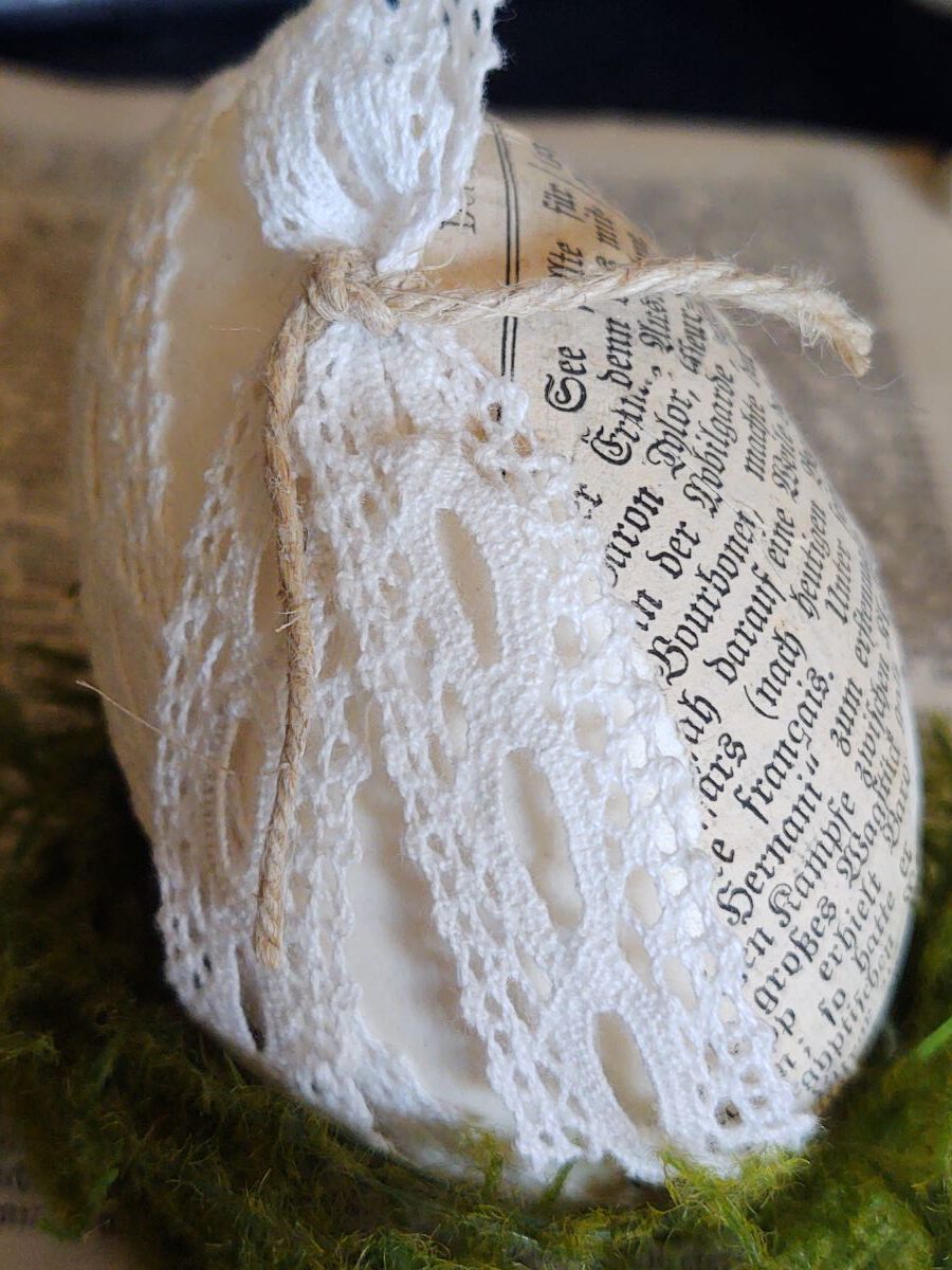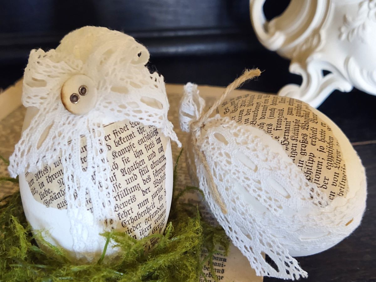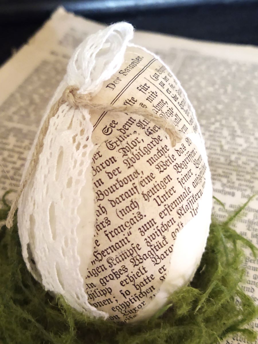 Gänse-Ei mit Spitze und alter Buchseite verziert